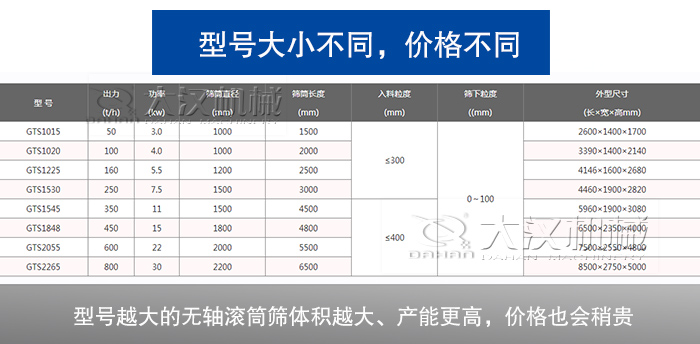 該設備型號有多種,每種型號的設備機重、體積、效率、產能、電機功率等各不一樣,型號越大的無軸滾筒篩體積越大、產能更高,價格也會稍貴些,不過給客戶帶來的經濟利潤將會更顯著;反之,型號小的無軸滾筒篩價格低,適合于小規模企業,效益較大型號設備低些。