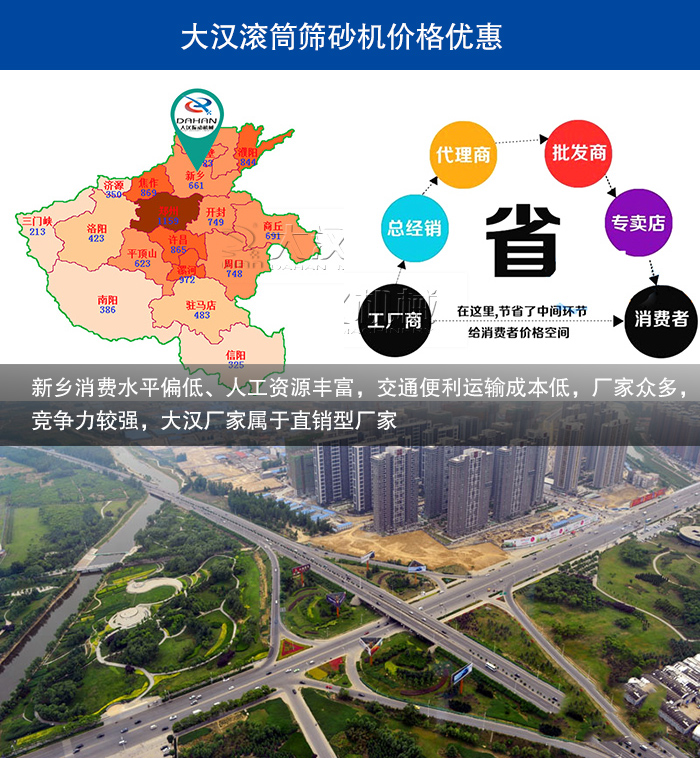 3、新鄉地區消費水平偏低,針對購買用戶群體多為周邊城市,從消費者出發,我們廠家制定價格一般偏低,另外大漢廠家屬于直銷型廠家,無中間商,滾筒篩沙機價格更便宜;