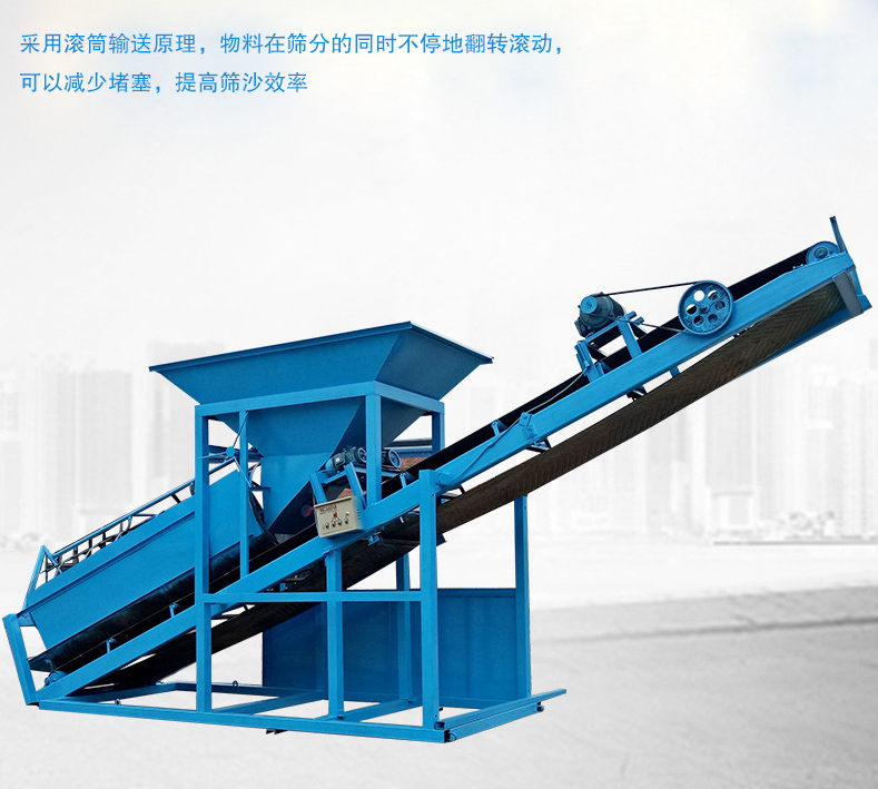 1、采用滾筒輸送原理,物料在篩分的同時(shí)不停地翻轉(zhuǎn)滾動(dòng),可以減少堵塞,提高篩沙效率。