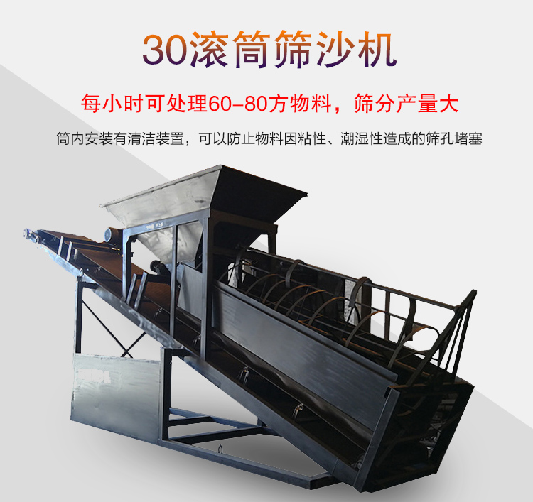 30型滾筒篩沙機(jī)產(chǎn)量是根據(jù)篩網(wǎng)孔徑和毛料含沙比來決定等,如8mm篩網(wǎng),毛料中8mm以下的有70%,那么產(chǎn)量就是70*70%=49方。